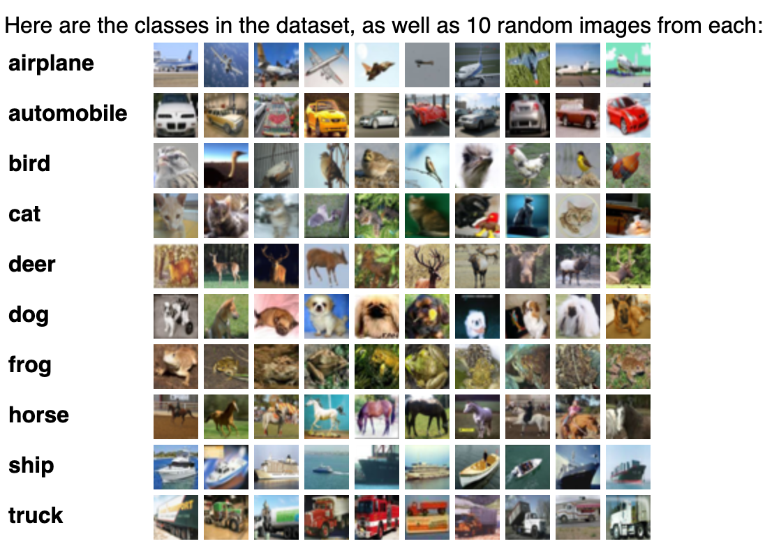 - dataset : cifar100 https://www.cs.toronto.edu/~kriz/cifar.html CIFAR-10 and CIFAR-100 datasets < Back to Alex Krizhevsky's home page The CIFAR-10 and CIFAR-100 are labeled subsets of the 80 million tiny images dataset. They were collected by Alex Krizhevsky, Vinod Nair, and Geoffrey Hinton. The CIFAR-10 dataset The CIFAR-10 dataset consists of 60000 www.cs.toronto.edu 작업에 필요한데... 없어서 만듦 idx : ..